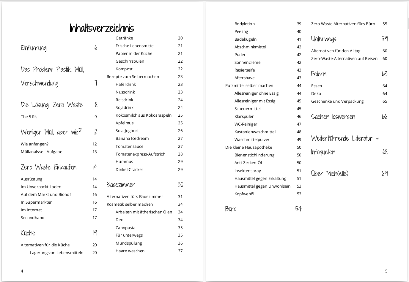 Du suchst ein übersichtliches, erschwingliches und kompaktes Buch zum Thema Zero Waste? Gratuliere, du wurdest gerade fündig :) Vom Badezimmer, über Küche bis zu Zero Waste Feiern findest du ganz viele Tipps, Rezepte und Alternativprodukte, wie du Müll enorm minimieren kannst. Alles davon ist bei uns zuhause erprobt.